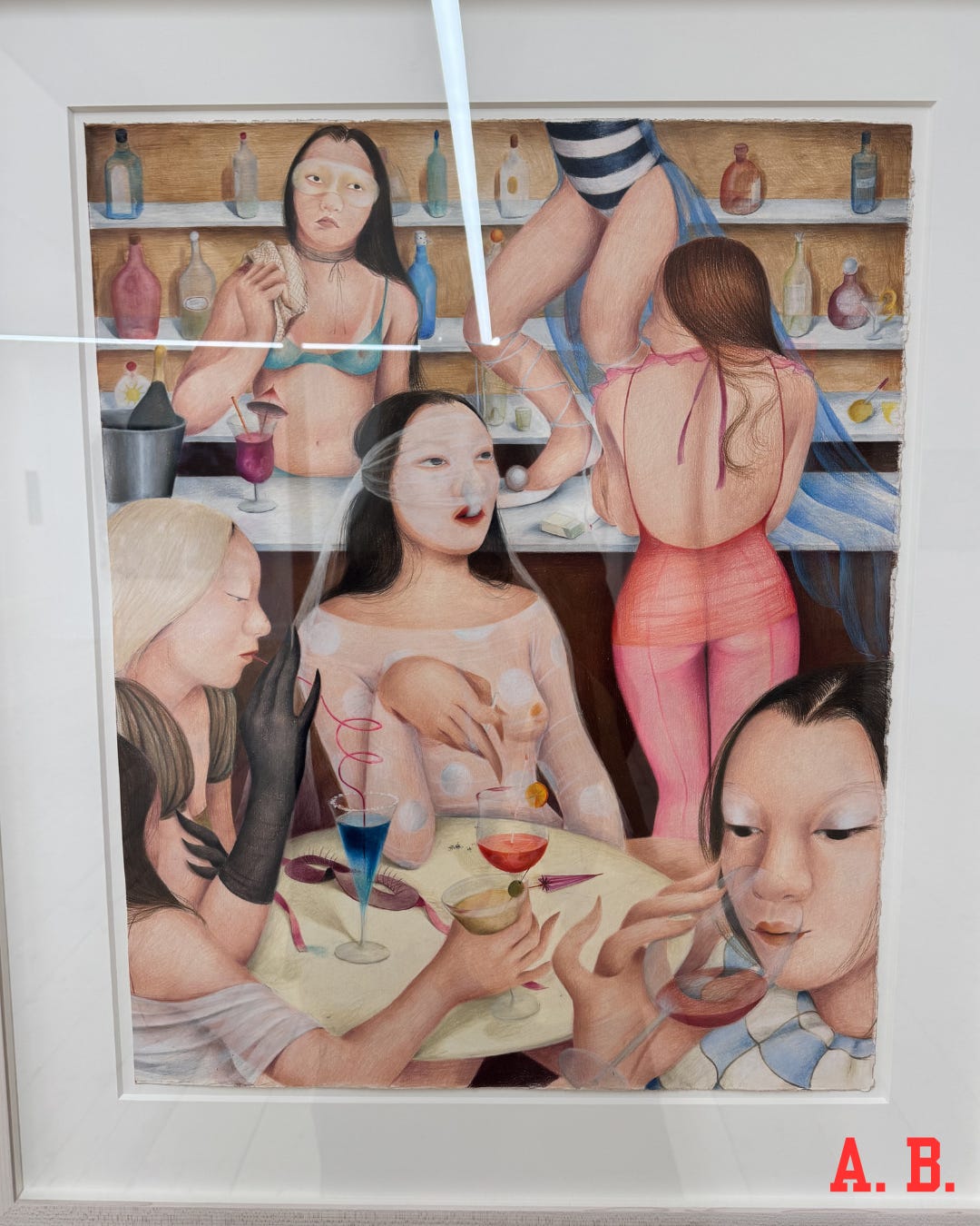 “Grand Opening” at Scroll (291 Grand Street, 4th Floor - until 3/14) - I knew I definitely needed to stop by Scroll’s new spot in the Lower East Side, conveniently located above Shu Jiao Fu Zhou, the cash-only dumpling spot that is worth the long line. Wow. What an incredible space—open, airy, the pale wooden floors still smelling of sawdust. 35 artists’ work lines the walls, mostly figurative painting. This is a show I’d want to shop if I were a young collector trying to find accessible pieces to live with. I’m excited for their next hang: an Adèle Aproh solo show, opening March 20th. Her drawing, below, was one of my favorites.